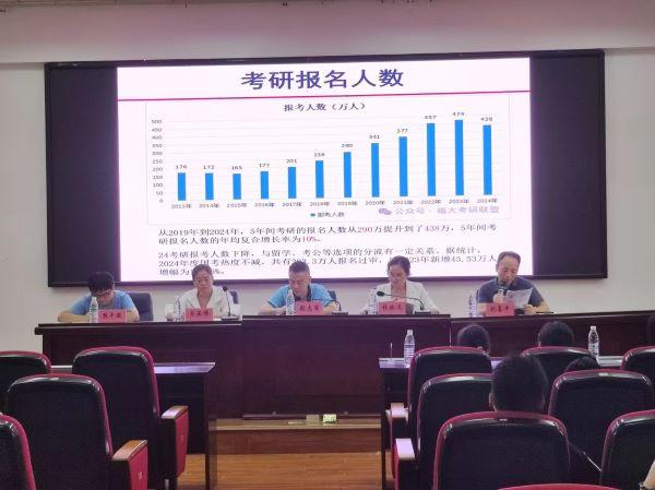 刘喜平副院长则对学院研究生招生情况及考研指导进行了详细介绍,他通过数据分析,指出了考研报名人数的增长趋势,以及考研过程中学生常见的误区。他建议学生们在选择考研目标时,要根据自身实力和专业兴趣,做出理智的选择。