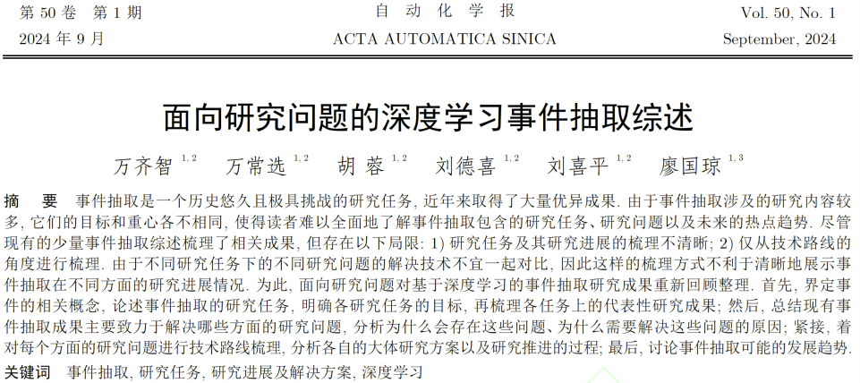 近期,计算机与人工智能学院教师万齐智以第一作者身份投稿的“面向研究问题的深度学习事件抽取综述”论文被《自动化学报》收录刊登。