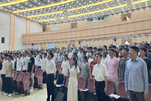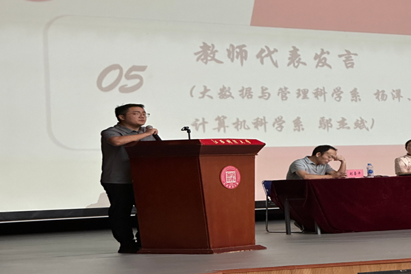 教师代表发言,大数据与管理科学系杨洋老师对新生寄语期盼:“大学不仅是学习知识的殿堂,更是培养实践能力的平台,同学们要积极参与社会实践,科研项目和创新活动,把课堂上学到的理论知识,运用到实际中去。”计算机科学系鄢杰斌对如何调整学习状态做出几点建议。