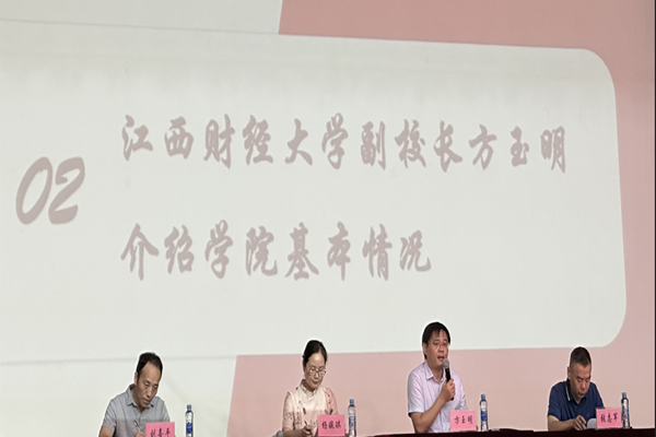 江西财经大学副院长方玉明介绍学院基本情况。方玉明教授表示学院前途光明。向新生们说明了大学与高中的不同点,对大学该怎么做作出几点建议,表达了对新生的殷切嘱托。“在座的不仅仅代表自己,代表这个家庭,代表这个地方,代表我们中华民族。”