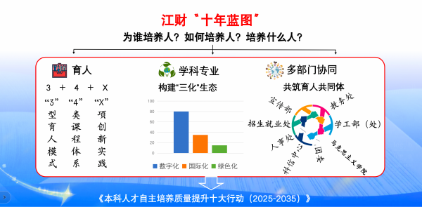 以十年蓝图擘画未来,以“3+4+X”体系重塑培养生态,以学科专业“三化”转型引领发展方向,以多部门协同凝聚育人合力,江西财经大学本科人才自主培养的引擎已全速启动。这场始于此刻的全方位“冲刺”,不仅将深刻塑造未来十年江财学子的卓越竞争力,更将为服务中国式现代化江西篇章与国家高质量发展,源源不断地输送可堪大用、能担重任的栋梁之材。(图文/教务处 审核/姜莹 赵旻 成亚林)