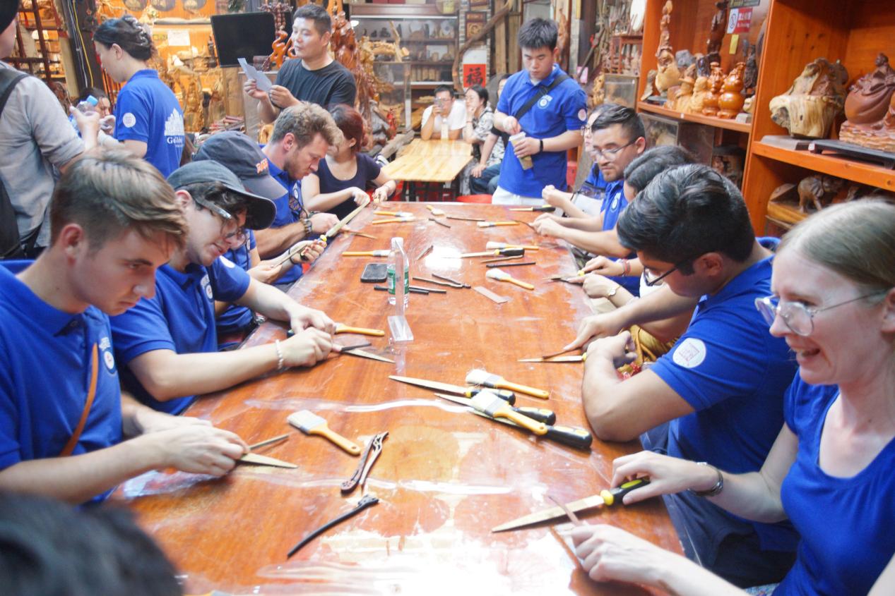 在“东方莎士比亚”汤显祖的故里抚州,营员们沉浸式体验了一场跨越四百年的戏剧文化盛宴。在戏剧工坊,营员们身着精美戏服,在专业老师的指导下学习水袖功、折扇功等戏曲表演技巧,亲身体验“生旦净末丑”不同行当的独特魅力。非遗传承人徐斌凯、张小娟现场亲授临川篾编、抚州木雕、中国结绳等传统技艺,学员们亲手制作竹编器皿、木雕挂件,感受传统手工艺的温度。文昌里历史文化街区里,大型实景演出《寻梦牡丹亭》运用全息数字影像与巨型圆环投影技术,将“游园惊梦”的经典场景以震撼的视觉效果重现,让杜丽娘与柳梦梅的爱情故事穿越时空与当代观众对话。“这场演出不仅让我看到了中国传统戏曲的永恒魅力,更惊叹于现代科技让文化遗产焕发的全新生命力。”丹麦奥尔堡大学学生Tina说道。从传统工艺到数字戏剧,营员们深刻感受到了中华优秀传统文化的创造性转化与创新性发展。