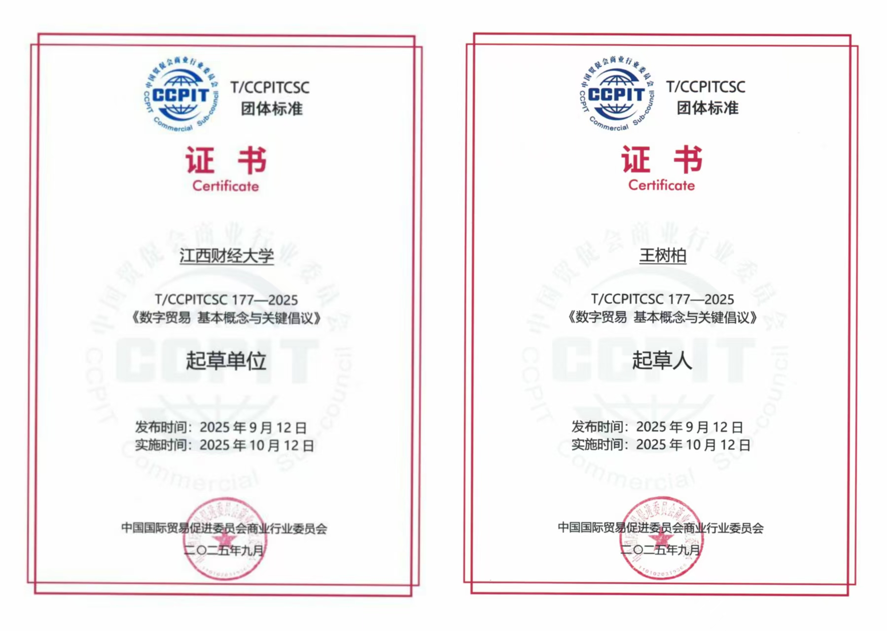 近日,中国国际服务贸易交易会期间,第九届中国服务贸易标准化论坛成功举办。在论坛的新标准发布与启动仪式上,由浙江大学中国数字贸易研究院牵头起草的《数字贸易基本概念与关键倡议(T/CCPITCSC177—2025)》正式亮相,国际经济与政治学院王树柏老师作为标准起草人全程参与研制工作,见证这一兼具理论价值与实践意义的标准落地。